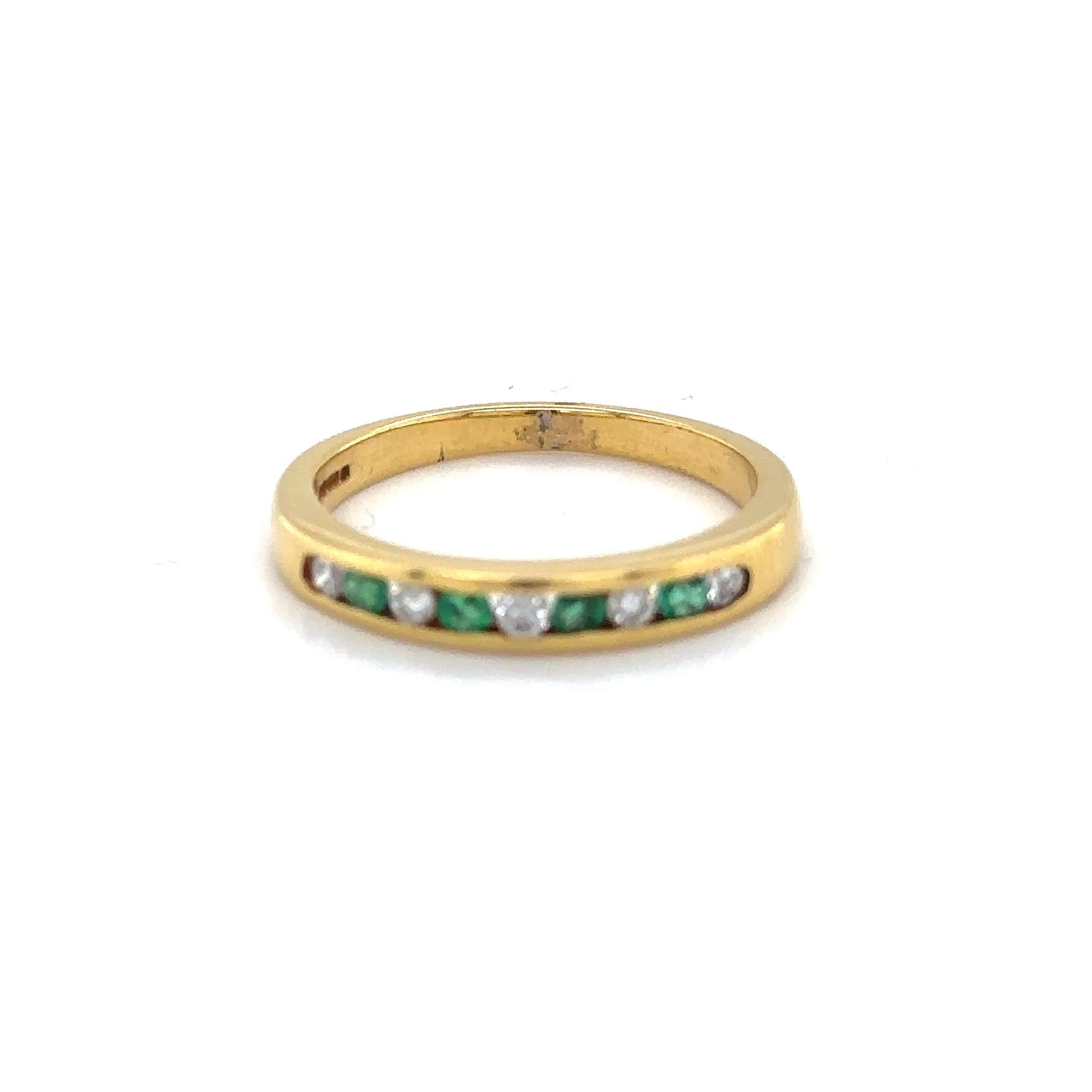 A timeless symbol of love and elegance, this exquisite 18 carat yellow gold half eternity ring showcases the perfect harmony of lush emeralds and brilliant diamonds.