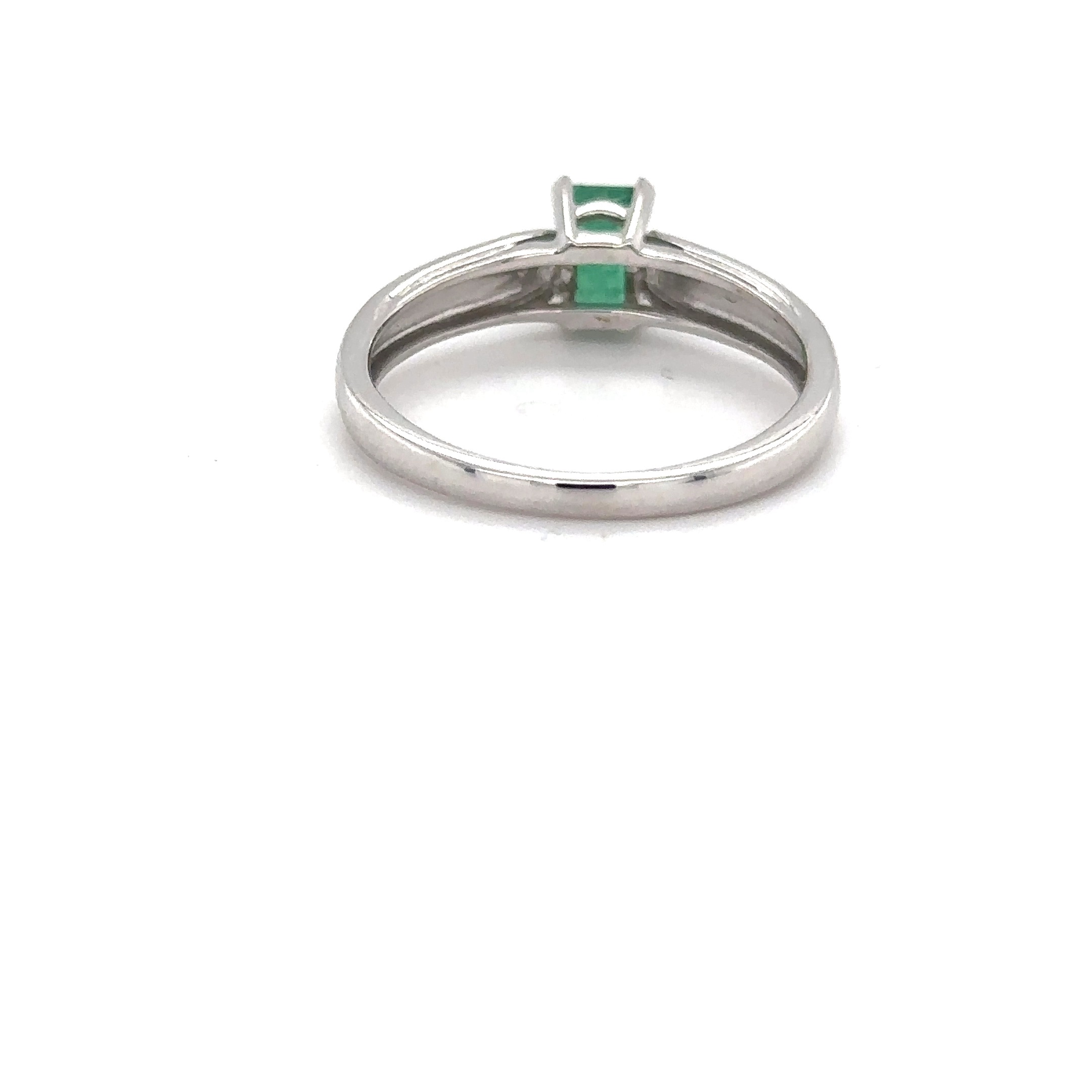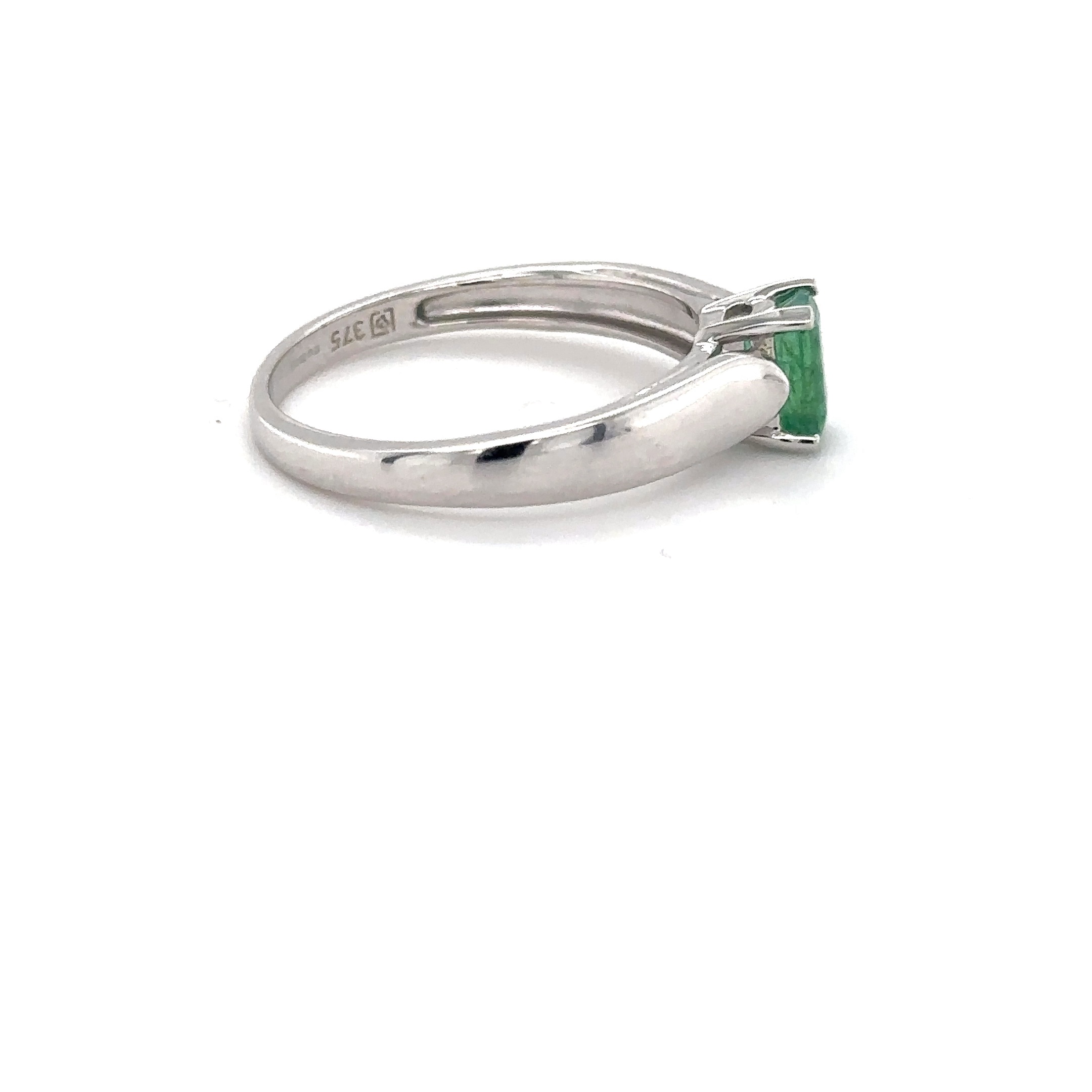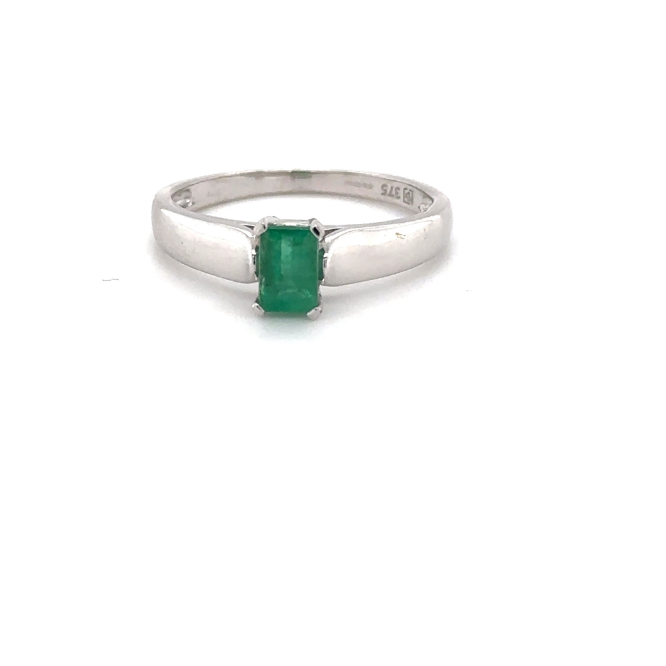 Timeless and refined, this stunning ring showcases a vivid emerald cut green set in sleek 9 carat white gold. The clean lines of the emerald shape highlight the natural beauty and rich green hue of the gemstone.