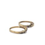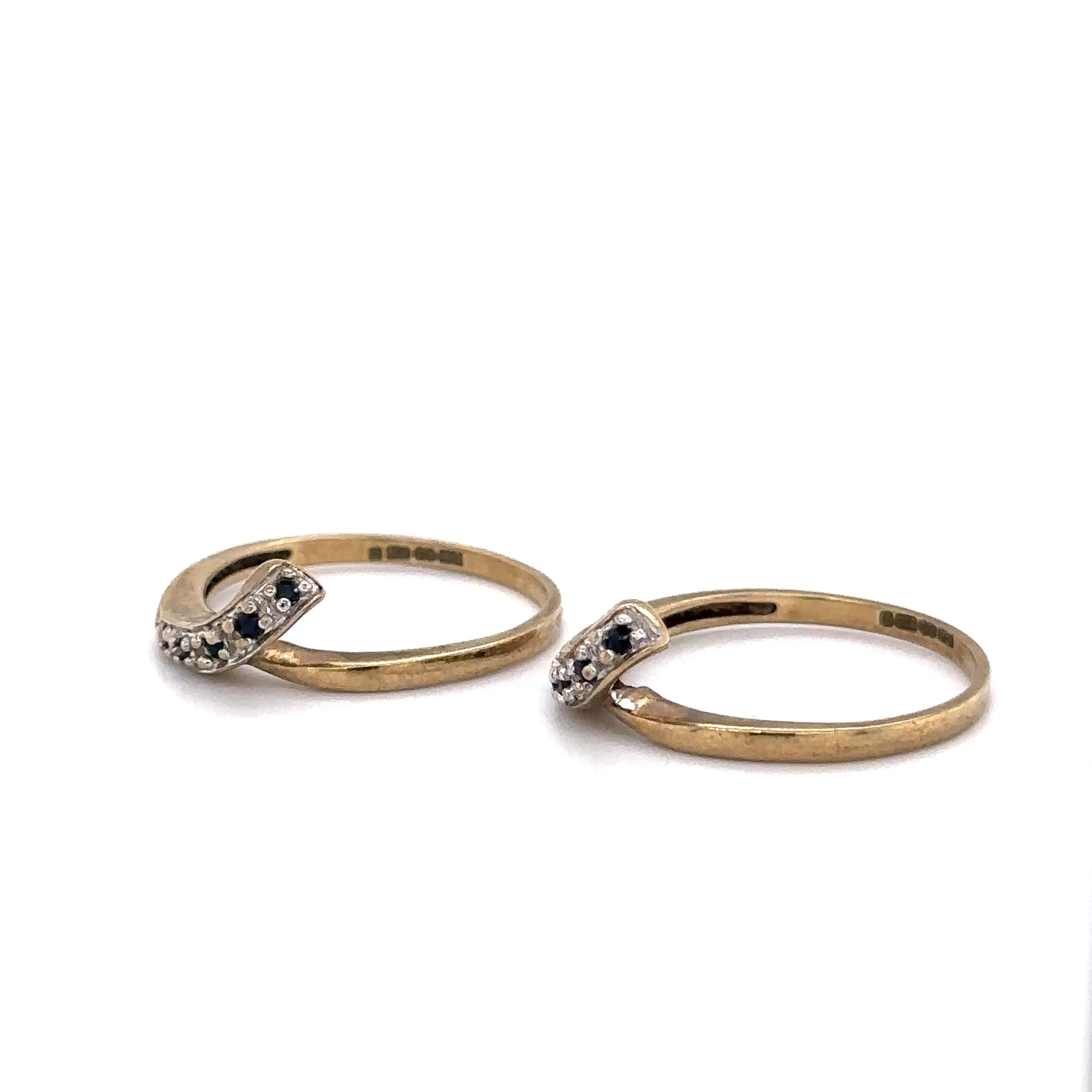 A symbol of unity and timeless elegance, this exquisite set features two interlocking rings crafted from 9 carat yellow gold. Designed to perfectly nest together, both set in diamonds and sapphires.