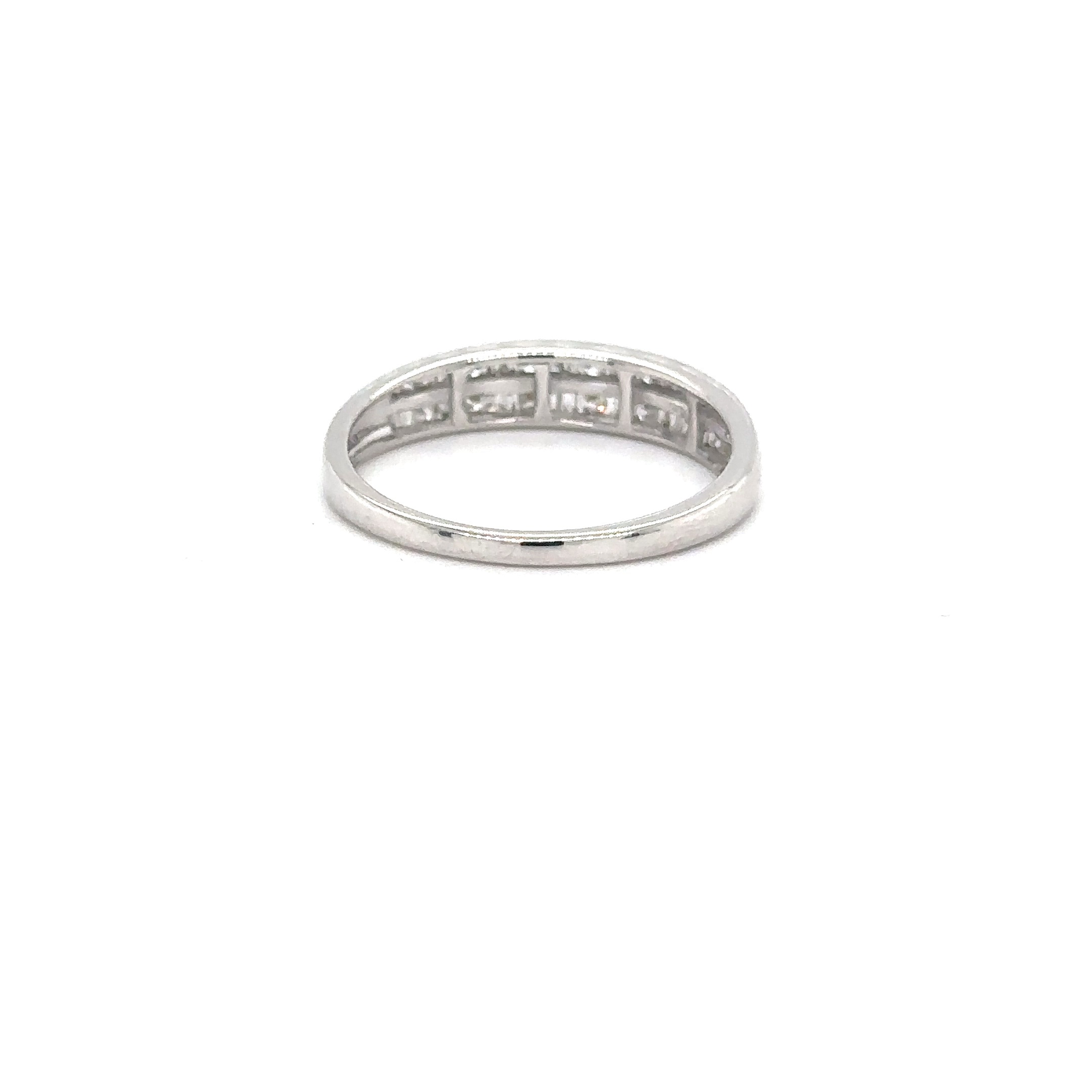 This striking eternity ring is crafted in luminous 9 carat white gold and features a sophisticated two-row design . With a mix of sleek baguette cut stones and classic round brilliant stones.